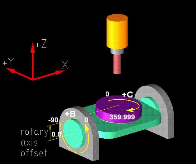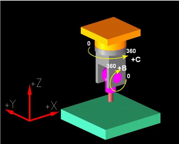兩個旋轉軸均屬擺頭類,B 軸旋轉平面為 ZX 平面,C 軸旋轉平面為 XY 平面。